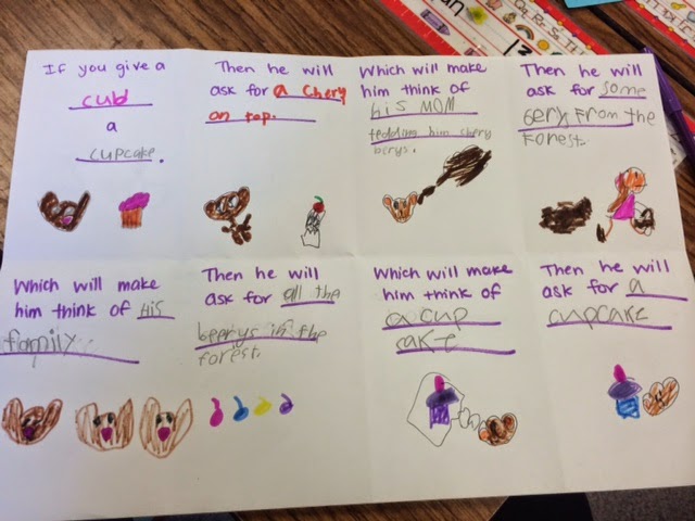 This week we have been busy reading "If Your Give a Pig a Pancake" by. Laura Numeroff. It is a student favorite. We also read "If You Give a Moose a Muffin. We then created our own "If You Give a _____ a _____". We did one as a class, then as a group, finally as an individual. Our group/ class versions were done very simply on big paper folded into eighths. I even wrote in the sentence starters for them. I whipped it up real fast before my kids came in. Sometimes the best activities are those last minute ones that take very few copies. You can see below the class one then the group ones. The top was done as a class. On the group one they got to add pictures.